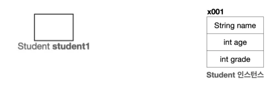 - Student student1 변수는 이제 메모리에 존재하는 실제 Student 객체(인스턴스)의 참조값을 가지고 있다.