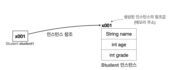 - new 키워드를 통해 객체가 생성되고 나면 참조값을 반환한다. 앞서 선언한 변수인 Student student1에 생성된 객체의 참조값(x001)을 보관한다.