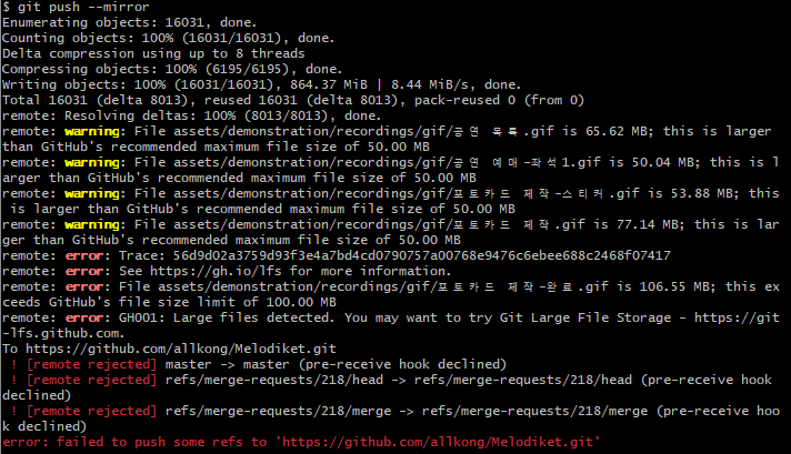 예전에는 대용량 파일이 없어 위 내용대로 하면 미러링이 됐었는데 이번에는 대용량 파일 때문에 오류가 발생했다.