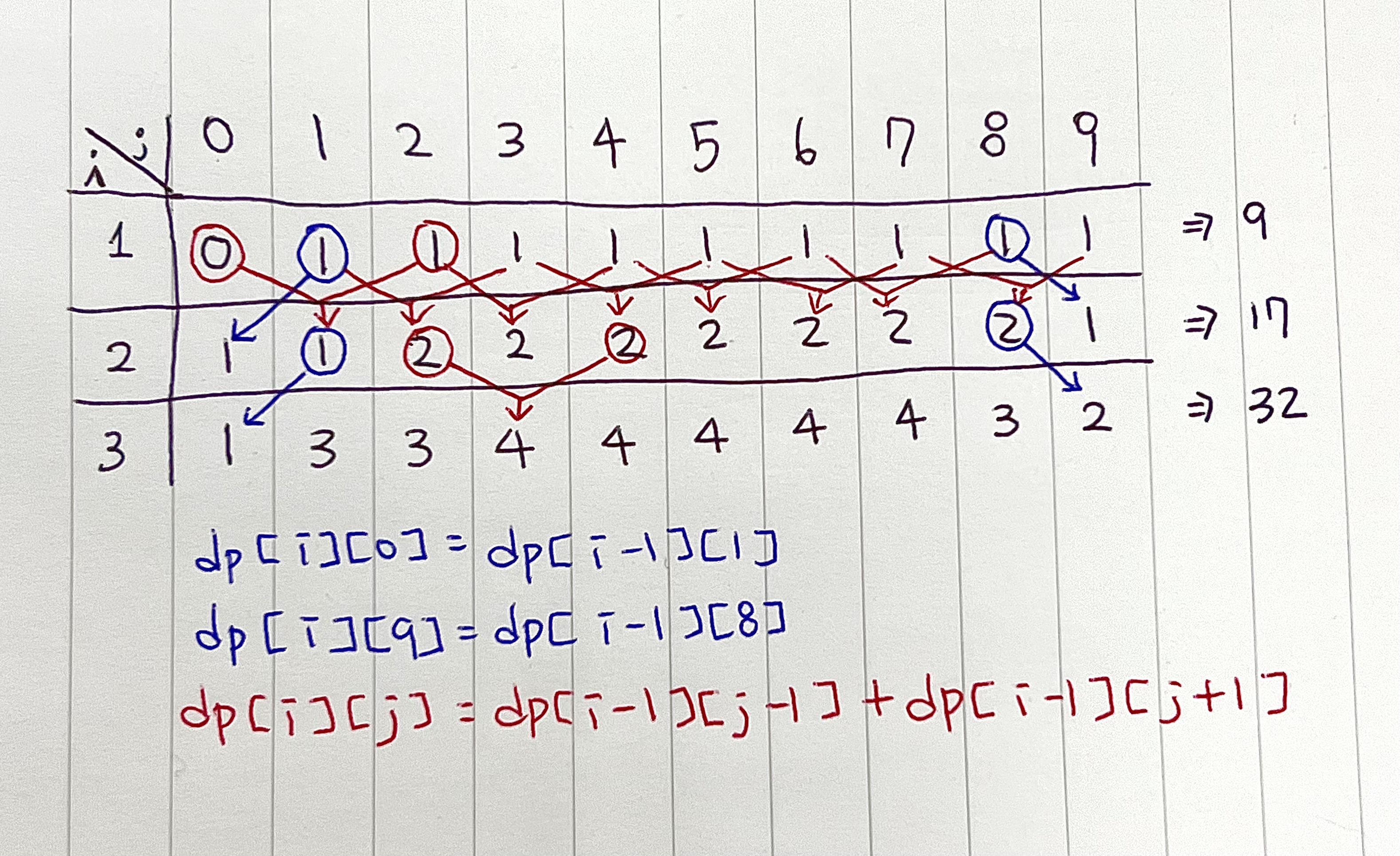 예를 들어, i=2, j=4, dp[2][4]=2이면 두 자릿수 숫자 중에 4로 끝나는 숫자가 2개(34, 54)라는 것이다.