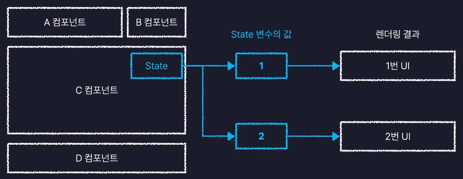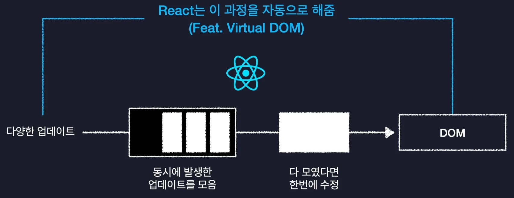 ⇒ React는 선언형 프로그래밍 방식으로, 업데이트를 위한 복잡한 동작을 직접 정의할 필요 없이 특정 변수의 값을 바꾸는 것만으로도 화면을 업데이트 시킬 수 있다.