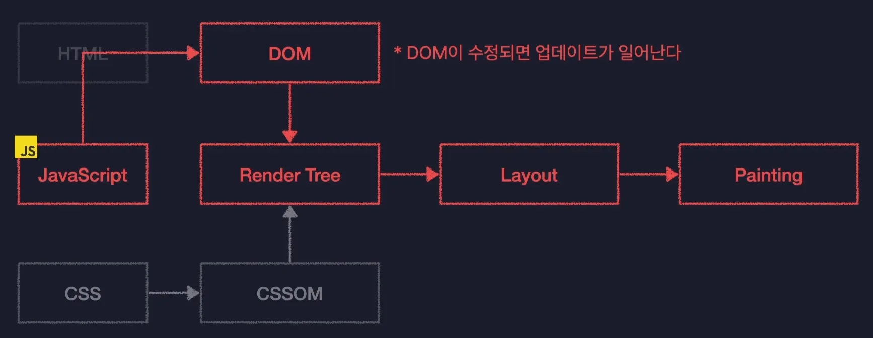 - JavaScript가 DOM을 수정하면 업데이트 발생