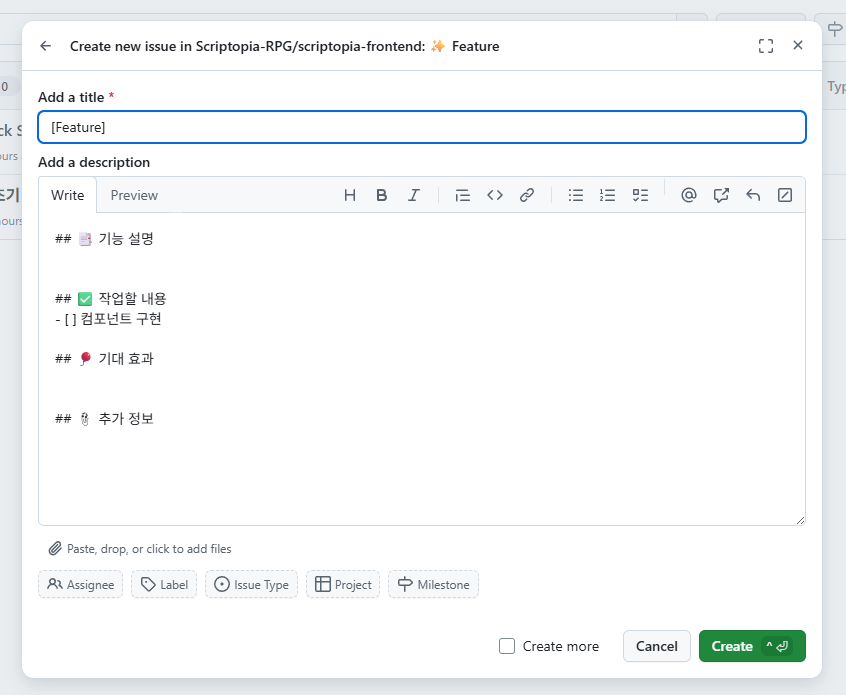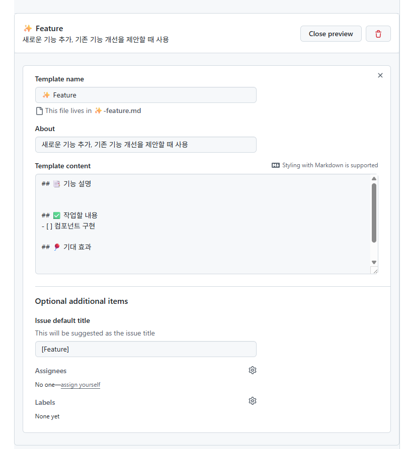 내용 뿐만 아니라 기본 제목, Assignee, Label도 지정할 수 있다.
