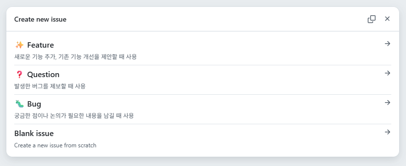 | 새로운 기능 추가, 기존 기능 개선을 제안할 때 사용 | 발생한 버그를 제보할 때 사용 | 궁금한 점이나 논의가 필요한 내용을 남길 때 사용 |