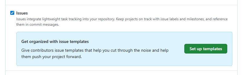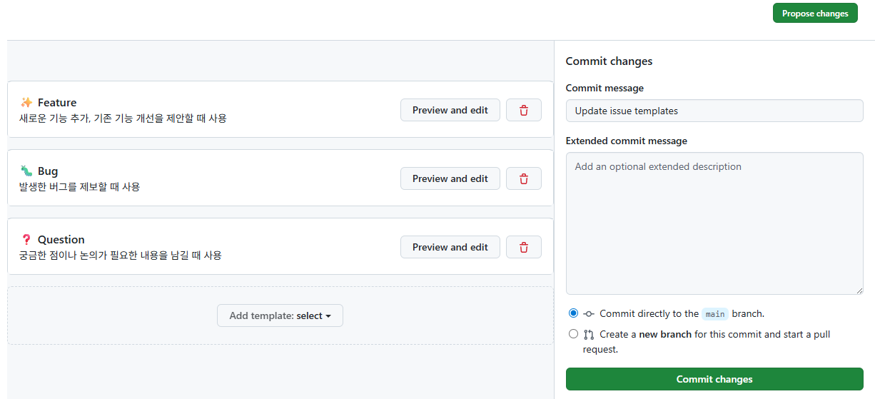 이렇게 웹으로 만들지 않아도 그냥 바로 루트에 .github/ISSUE_TEMPLATE 폴더를 만들어서 그 안에 이슈 템플릿 파일을 넣어도 된다.
