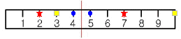준성이는 1㎝ 간격으로 눈금이 매겨져 있는 줄자를 가지고 있다. 그 줄자에 있는 서로 다른 눈금 6개에 한 눈금에 하나씩 점이 찍혀 있는데, 빨간 점, 파란 점, 노란 점이 각각 두 개씩 있다.