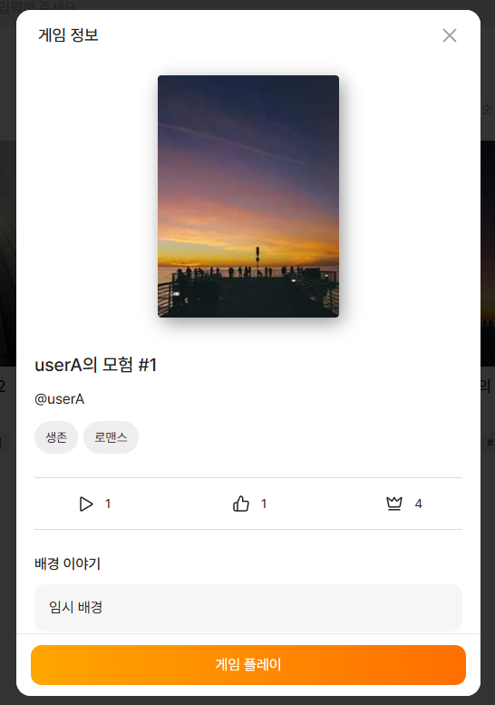 게임 목록 페이지에서 특정 게임 카드를 클릭하면 이러한 게임 상세 모달이 뜨는 구조이다.