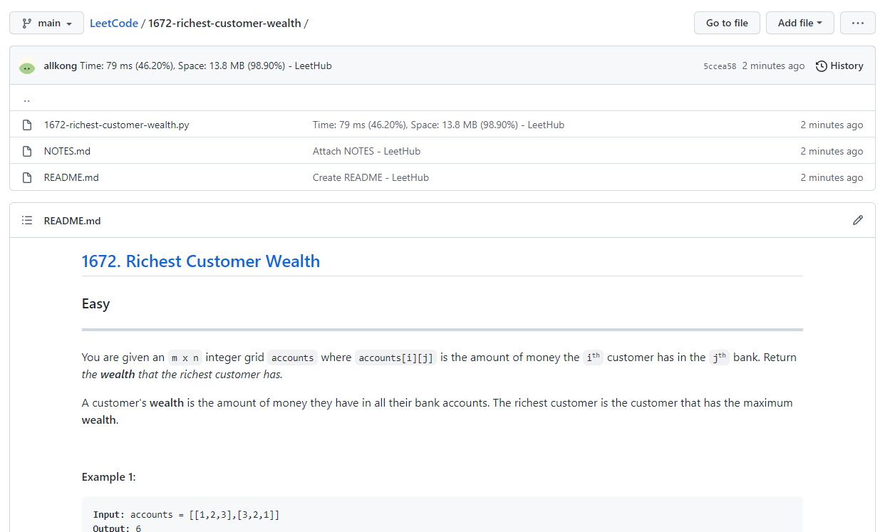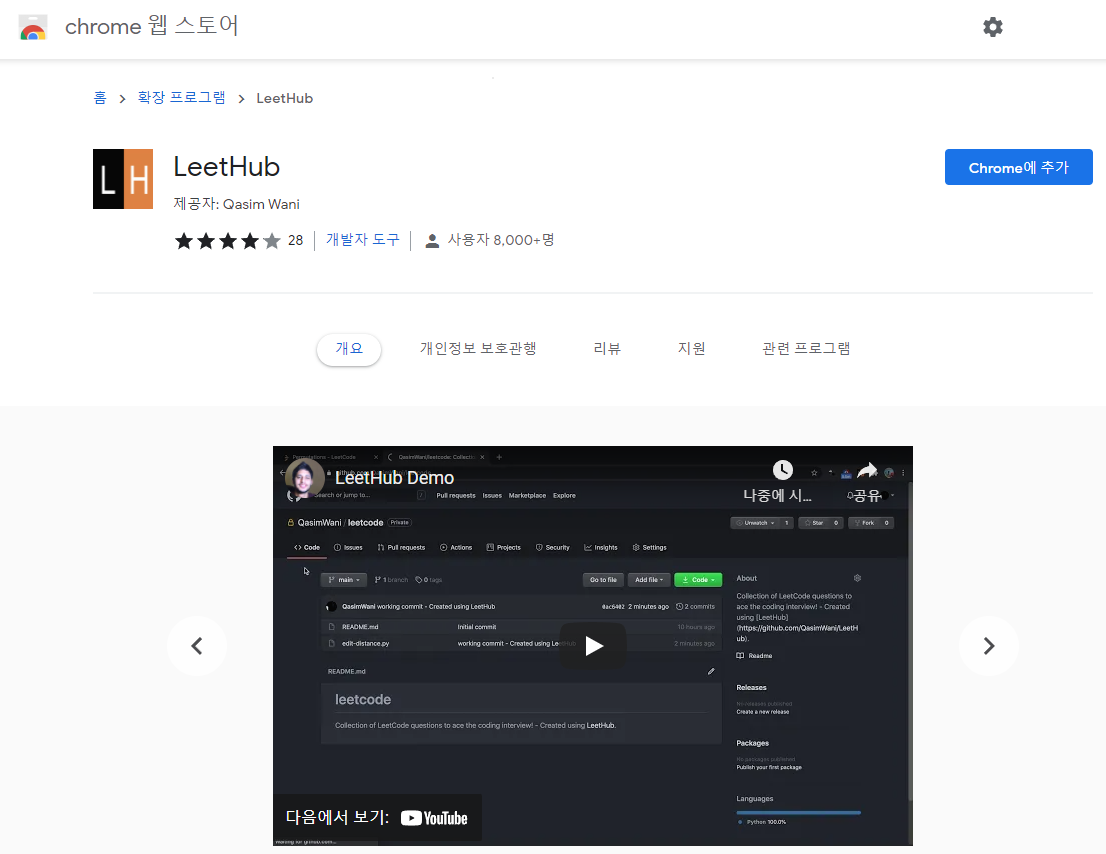 릿허브는 릿코드에서 문제를 맞히면 자동으로 깃허브에 코드를 업로드하는 크롬 확장 프로그램이다. 릿허브를 사용하면 단순히 코드만 업로드해주는 것이 아니라 README에 문제 내용을 업로드해주고 시간과 메모리를 커밋해준다.