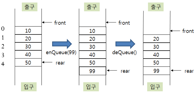 입출구가 별도인 선입선출(FIFO, First In First Out) 구조이다.