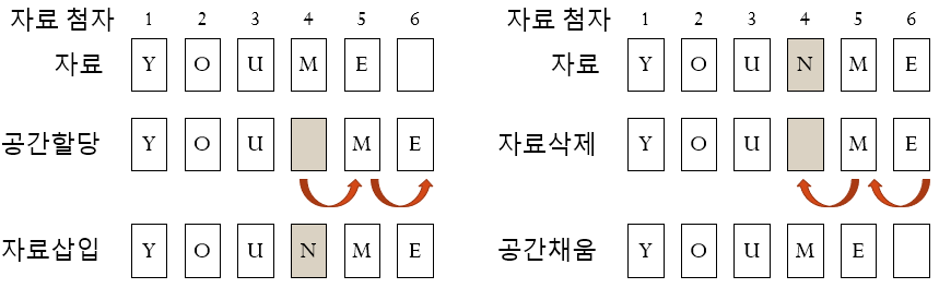 배열('같은 자료형'을 가진 자료들을 메모리에 연속적으로 저장하는 방식)의 삽입과 삭제를 사용한다.