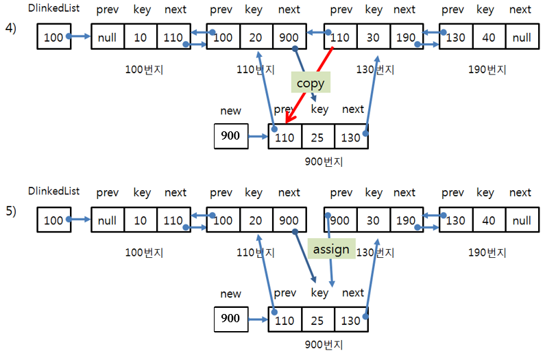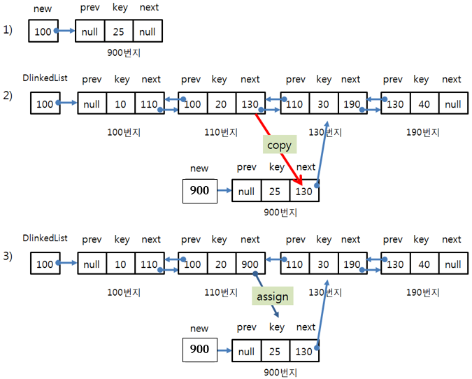 new -> next -> prev = new; // 후행 노드의 prev값 갱신
