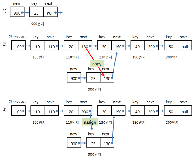 Input: 단순 연결 리스트, 삽입값 k, 삽입 위치 노드 포인터 previous
