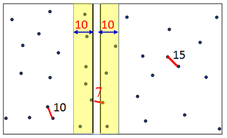 5. d = min{dist(CP⒧), dist(CP⒭)}일 때, 중간 영역에 속하는 점들 중에서 최근접 점의 쌍을 찾아서 이를 CP⒞라고 하자. 단, dist()는 두 점 사이의 거리이다.