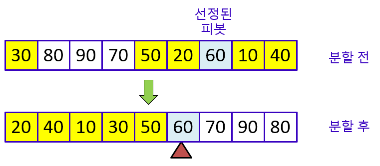 피봇(pivot)으로 정해진 배열의 원소(숫자)를 기준으로 피봇보다 작은 숫자들은 왼편으로, 피봇보다 큰 숫자들은 오른편에 위치하도록 분할한다. 피봇은 그 사이에 위치한다.
