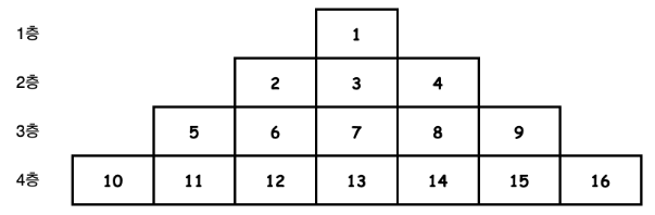 - 1층의 가장 왼쪽 블록에는 1이 적혀있으며, 블록에 적힌 숫자는 오른쪽으로 갈수록 1씩 증가한다.