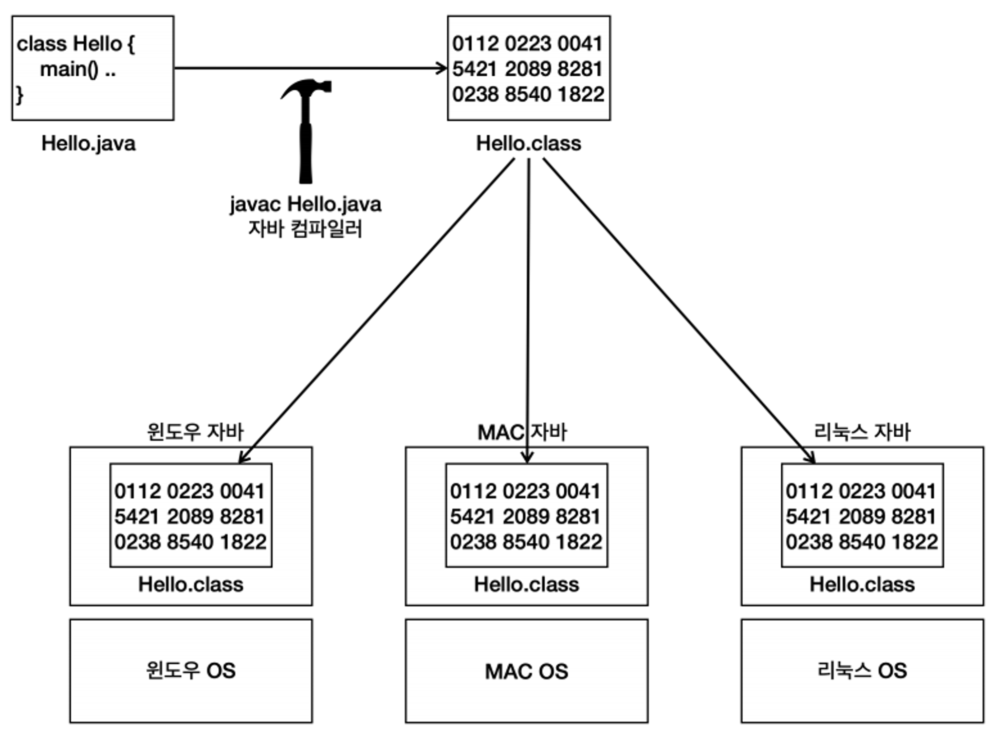 - 자바 프로그램은 자바가 설치된 모든 OS에서 실행할 수 있음