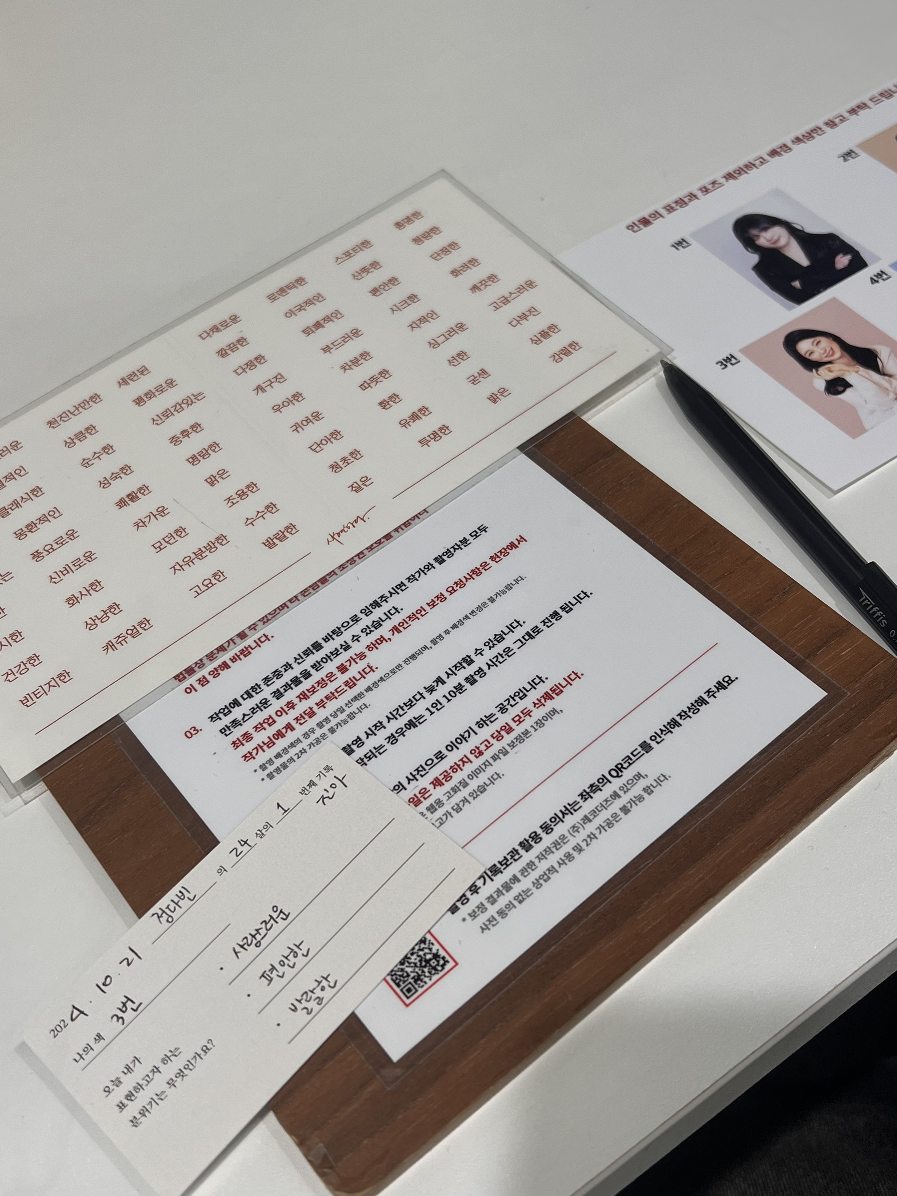 먼저 촬영을 진행하는 교실에 들어가면 앉아서 휴대폰으로 QR코드를 통해 동의서를 작성한 후, 배경을 골랐어요.